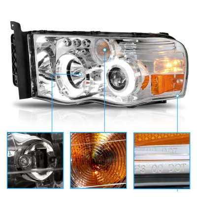 This Dodge Ram 2500 Projector Headlights will fit 2003, 2004, 2005 Dodge Ram 2500. Dodge Ram 2500 2003-2005 Projector Headlights Halo LED also features Chrome Housing Clear Lens Low Beam H3, High Beam H1. Replace or upgrade your Dodge Ram 2500 Projector Headlights with our Dodge Ram 2500 2003-2005 Projector Headlights Halo LED.
