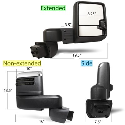 This Chevy Silverado 3500HD Towing Mirrors will fit 2020, 2021, 2022, 2023, 2024, 2025 Chevy Silverado 3500HD. Chevy Silverado 3500HD 2020-2025 Chrome Towing Mirrors Smoked LED Lights Power Heated Glass also features LED Running Lights, LED Signal Lights, LED Puddle Lights, Power Mirror Angle Adjustment, Heated Mirror, LED Rear Guidance Lamps, Manual Extend by Telescoping, Manual Folding, Include Blind Spot Monitor (BSM). Replace or upgrade your Chevy Silverado 3500HD Towing Mirrors with our Chevy Silverado 3500HD 2020-2025 Chrome Towing Mirrors Smoked LED Lights Power Heated Glass.