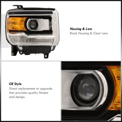 This GMC Sierra Projector Headlights will fit 2014, 2015 GMC Sierra. GMC Sierra 1500 2014-2015 Black Projector Headlights LED Signature DRL also features Projector Style Lighting,Direct Replacement,Easy Installation. Replace or upgrade your GMC Sierra Projector Headlights with our GMC Sierra 1500 2014-2015 Black Projector Headlights LED Signature DRL.