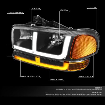 This GMC Sierra 1500HD Euro Headlights will fit 2001, 2002, 2003, 2004, 2005, 2006, 2007 GMC Sierra 1500HD. Replace or upgrade your GMC Sierra 1500HD Euro Headlights with our GMC Sierra 1500HD 2001-2007 Black LED DRL Headlights Switchback Bumper Lights N4.